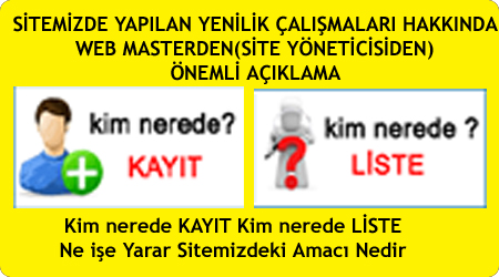 Sitemize Kim Nerede bölümü koyduk bu bölümün amacı Köylülerimizin Elektronik ortamda bir birleri ile iletişimini sağlamak ve köylülerimizin bulunmuş oldukları makam ve mevkilerde köylülerimizin iş ve işlemlerine yardımcı olmak ve Milliyetçilik duyguları ile köylülerimizin bir birlerine yardımcı olmalarını sağlamak.